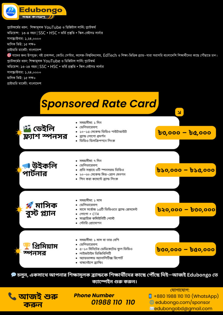 আমাদের কনটেন্ট বিশেষভাবে তৈরি করা হয় মাধ্যমিক, উচ্চমাধ্যমিক ও বিশ্ববিদ্যালয়ে ভর্তিচ্ছু শিক্ষার্থীদের জন্য। এর ফলে আমরা নিখুঁতভাবে নির্দিষ্ট অডিয়েন্সকে টার্গেট করতে পারি।